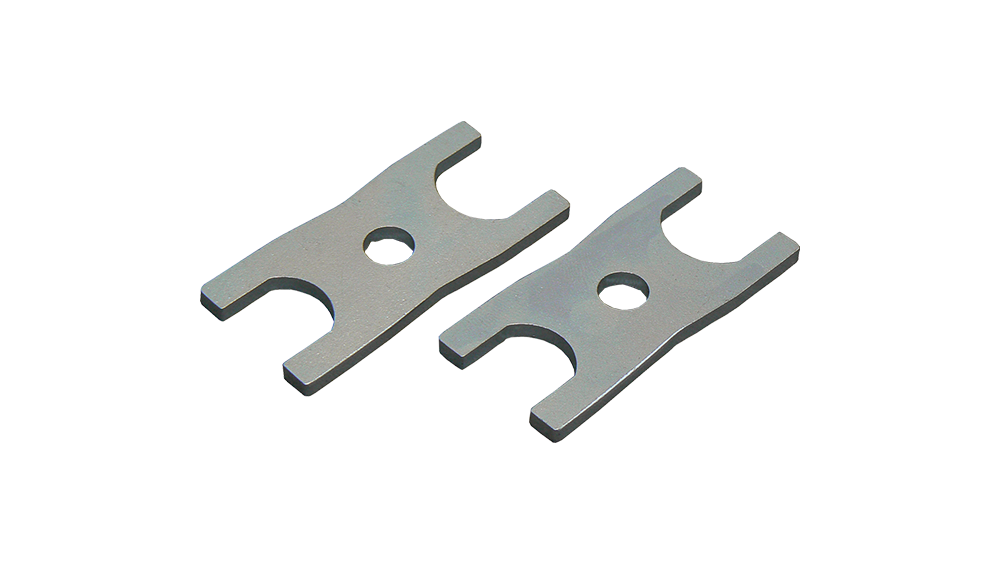 Duas peças metálicas planas cinzentas com recortes e orifício central